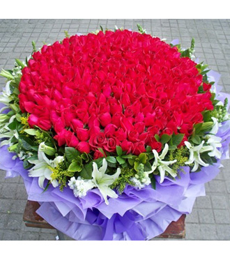 - 花材:365枝紅玫瑰,綠葉黃鶯外圍
